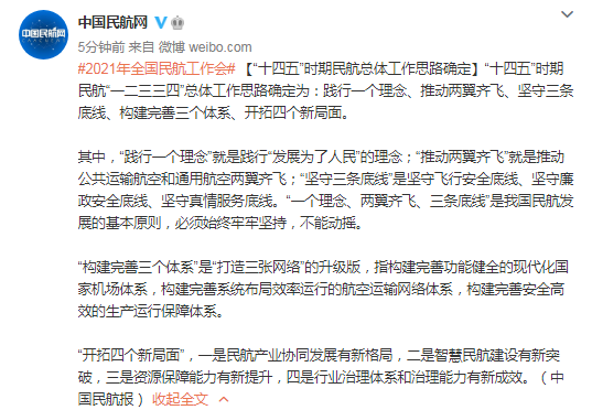 上证报中国证券网讯 据中国民航网微博消息,1月12日,2021年全国民航工作会议、全国民航安全工作会议以视频形式在京召开。会上传出的消息称,“十四五”时期民航“一二三三四”总体工作思路确定为:践行一个理念、推动两翼齐飞、坚守三条底线、构建完善三个体系、开拓四个新局面。