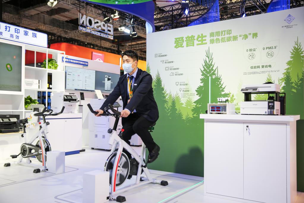 在第四届进博会技术装备展区爱普生展台,工作人员展示借助骑行产生的能量,让应用了冷印技术的喷墨打印机工作。新华社发