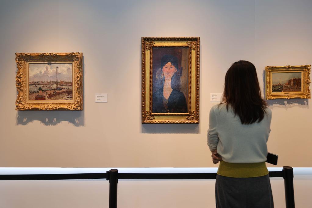11月6日,观众在第四届进博会服务贸易展区佳士得展位欣赏名画。新华社记者 王翔 摄