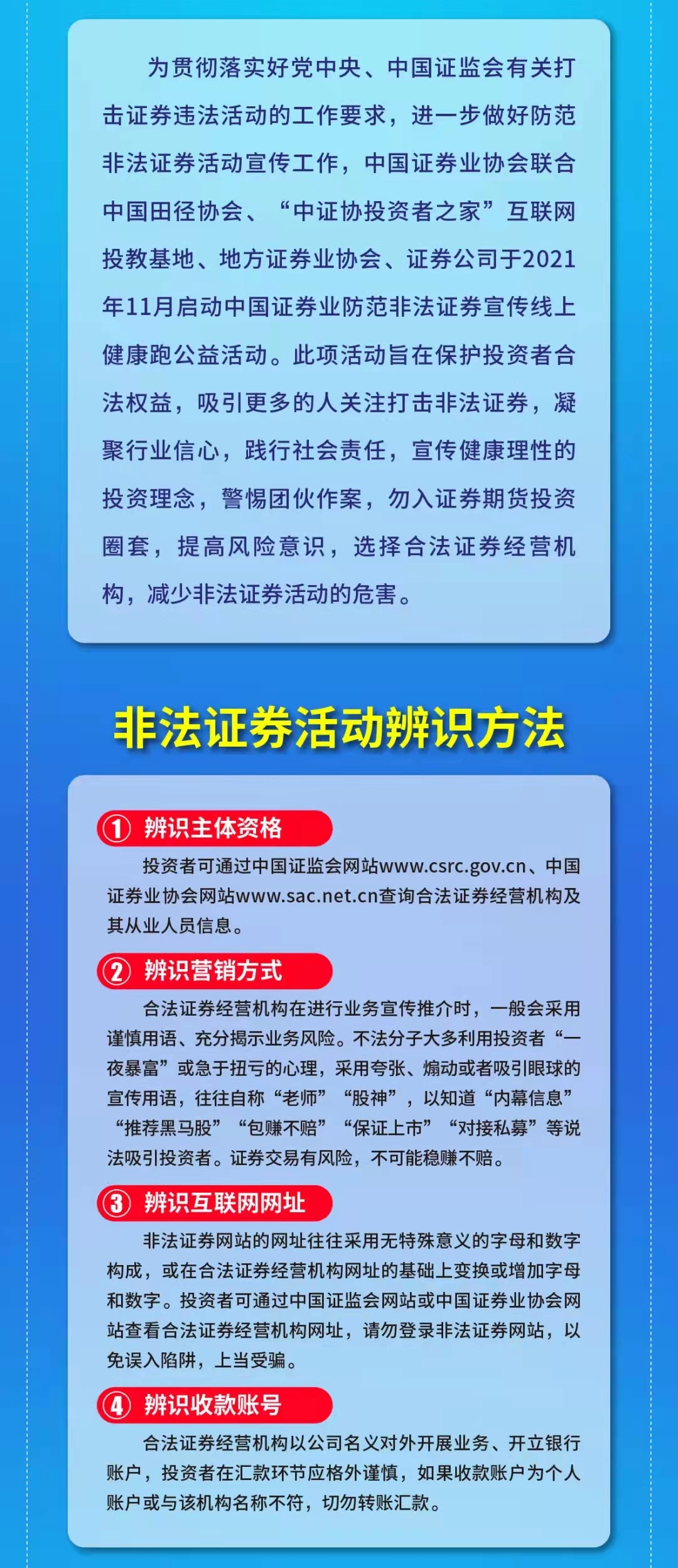 据悉,此项活动旨在保护投资者合法权益,吸引更多的人关注打击非法证券,凝聚行业信心,践行社会责任,宣传健康理性的投资理念,警惕团伙作案,勿入证券期货投资圈套,提高风险意识,选择合法证券经营机构,减少非法证券活动的危害。