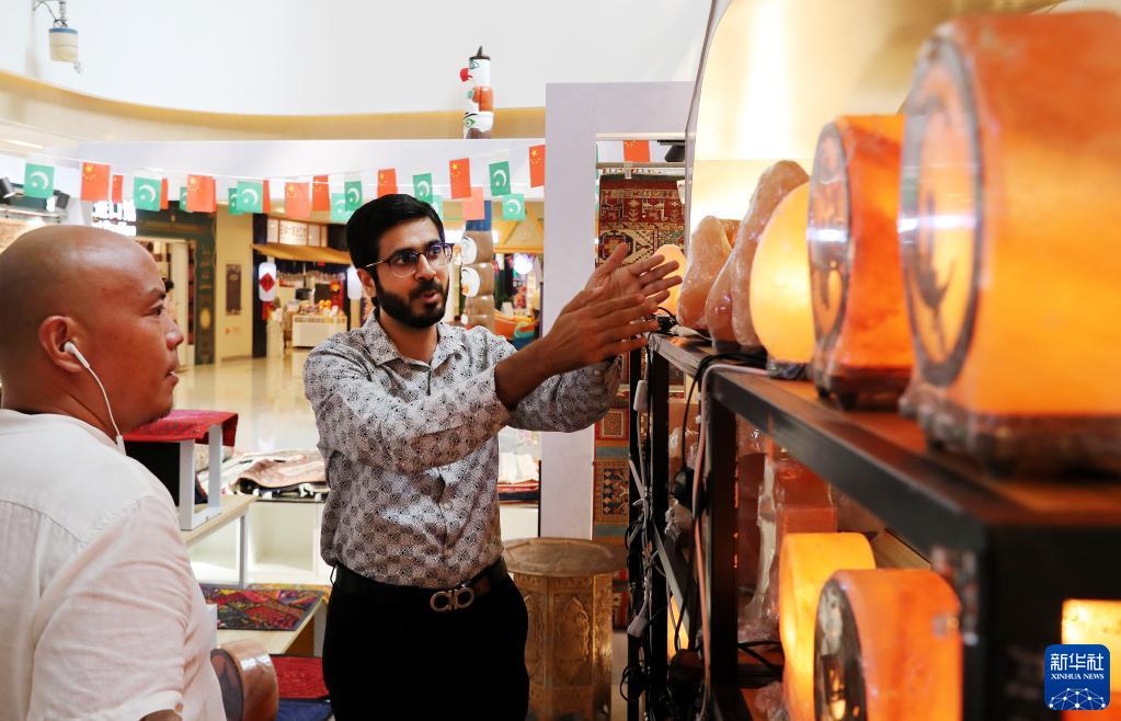 来自巴基斯坦的哈比(右)在位于上海绿地贸易港的商铺内向顾客讲解盐灯的特点和制作过程(9月7日摄)。新华社记者 方喆 摄