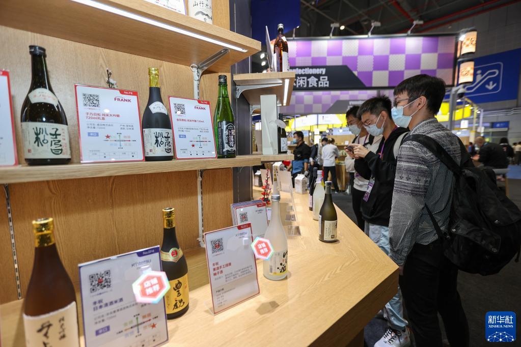 11月6日在第四届进博会食品及农产品展区日本贸易振兴机构展台拍摄的日本酒。新华社记者 王翔 摄