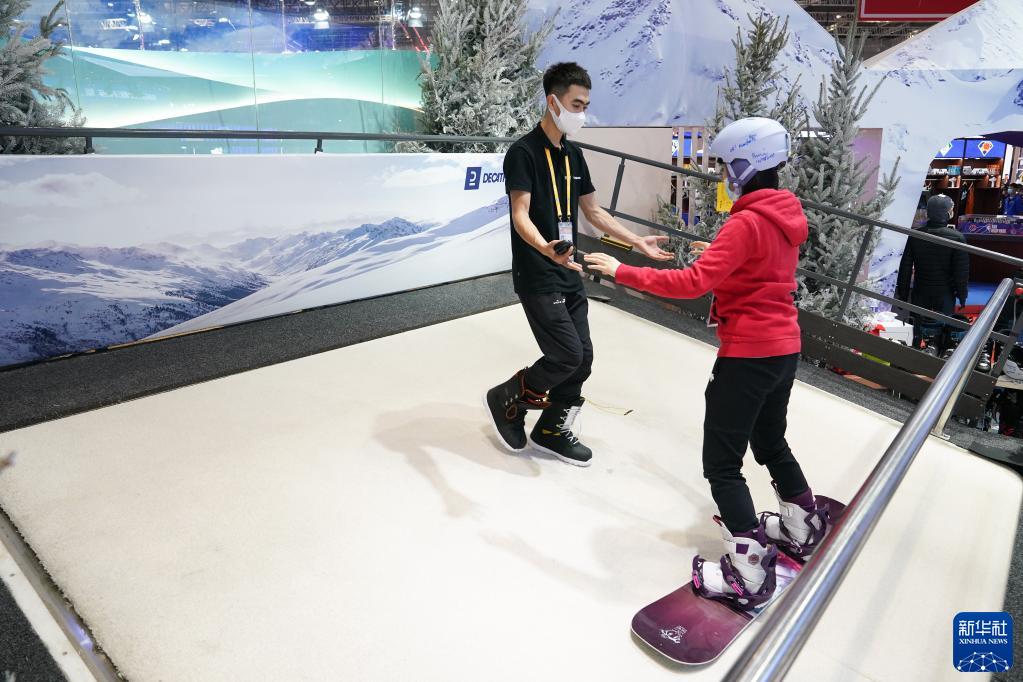 11月5日,参观者在第四届进博会消费品展区的一家展台体验滑雪。新华社记者 丁汀 摄