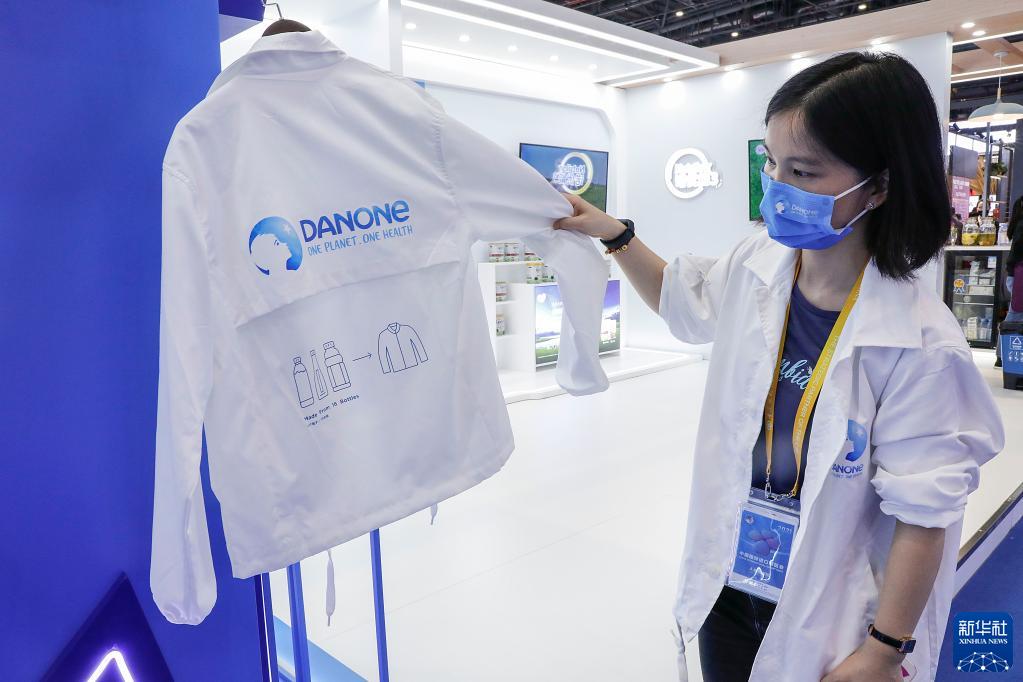 11月6日,工作人员在第四届进博会食品和农产品展区达能展台展示用塑料饮料空瓶制造的外套。新华社记者 张玉薇 摄