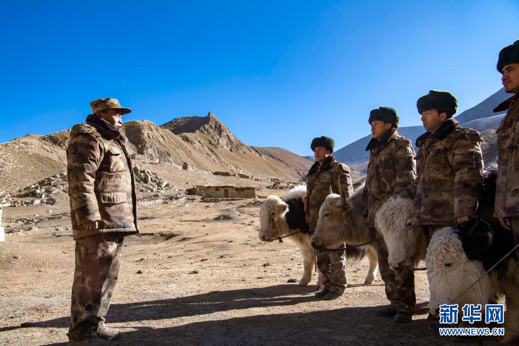 巡边队员出发前,新疆生产建设兵团三师叶城二牧场三连党支部书记刘前东(左一)叮嘱巡边重点、安全事项(2020年12月25日摄)。新华社记者 胡虎虎 摄