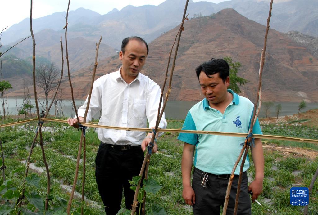 姜仕坤(左)在贵州晴隆县长流乡与村民交流(资料照片)。新华社发