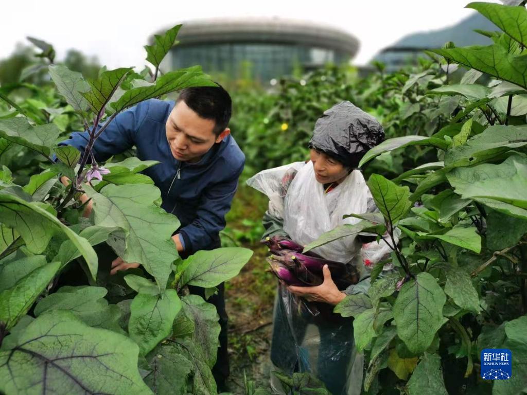 贵州省遵义市汇川区驻村干部余永流(左)和农户一起采摘茄子(资料照片)。新华社发