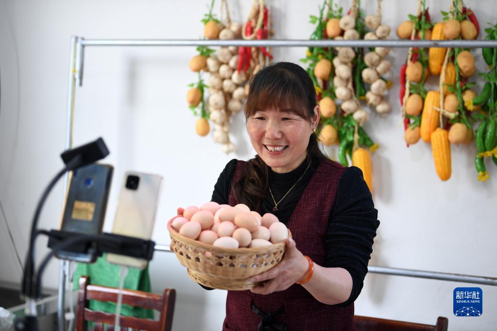 在安徽省六安市舒城县南港镇公义村钱元玲的家庭农场,钱元玲在直播间售卖土鸡蛋(2021年3月4日摄)。新华社记者 黄博涵 摄