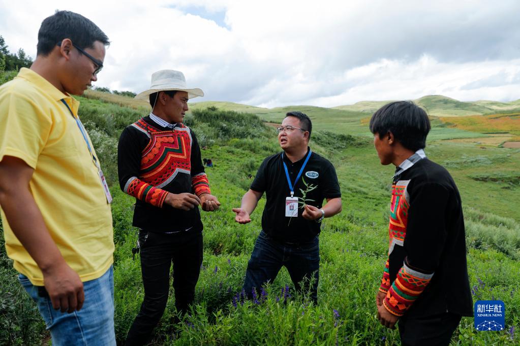 在位于四川省凉山彝族自治州昭觉县龙沟乡境内黄芩种植基地,西南医科大学副教授夏纪毅(右二)和该校派出的驻村工作队员俄且莫机(左一)为当地彝族群众讲授黄芩种植和采摘技术(2020年8月14日摄)。新华社记者 沈伯韩 摄