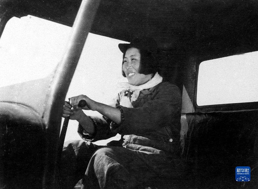 这是梁军在驾驶拖拉机(1950年摄)。新华社发