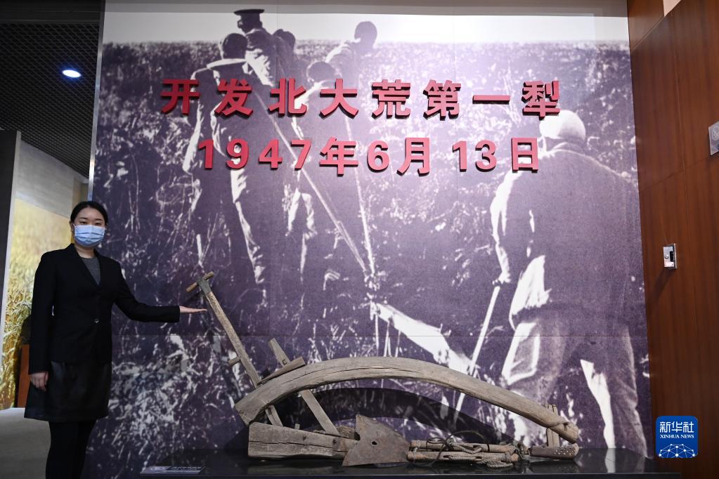 在北大荒博物馆,工作人员介绍开发北大荒第一犁的历史(2021年3月10日摄)。新华社记者王建威摄