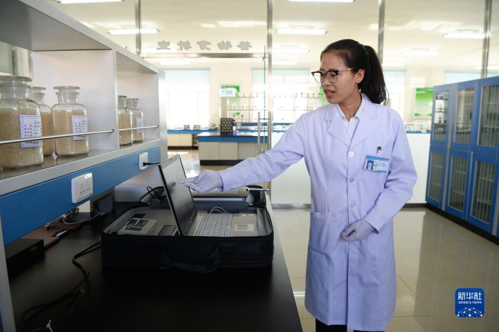 黑龙江北大荒建三江国家农业科技园区工作人员裴鑫宇在做谷物品质检测(2018年9月27日摄)。新华社记者 王凯 摄