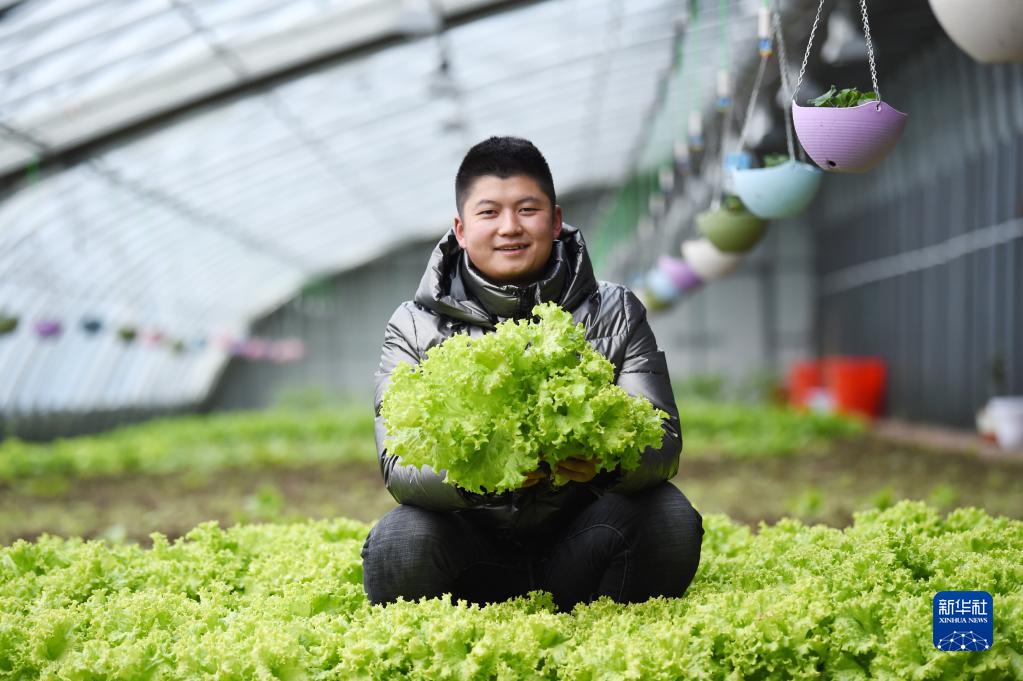 在黑龙江北大荒农垦集团双峰农场有限公司果蔬产业园区智控温室,工作人员在展示刚采摘的生菜(2021年3月5日摄)。新华社记者 王建威 摄