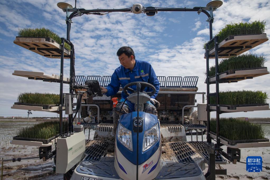 在北大荒集团红卫农场有限公司智慧农业先行示范区内,工作人员设置无人驾驶插秧机工作路径(2021年5月11日摄)。新华社记者 张涛 摄
