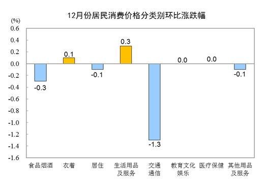 12月份,全国居民消费价格环比下降0.3%。其中,城市下降0.3%,农村下降0.3%;食品价格下降0.6%,非食品价格下降0.2%;消费品价格下降0.4%,服务价格持平。