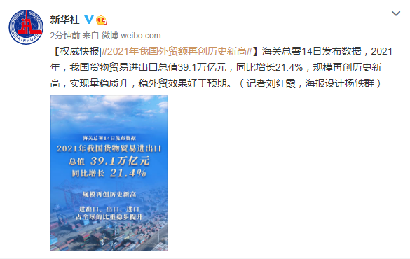 海关总署14日发布数据,2021年,我国货物贸易进出口总值39.1万亿元,同比增长21.4%,规模再创历史新高,实现量稳质升,稳外贸效果好于预期。(记者刘红霞,海报设计杨轶群)