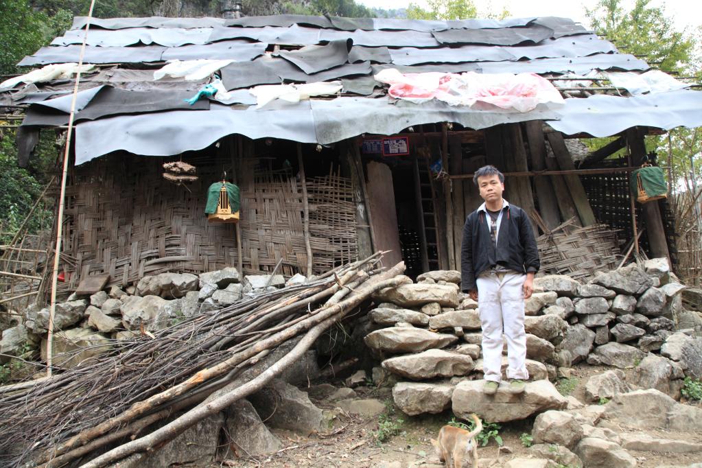 图为一名白裤瑶村民在自己的茅草房前。(南丹县委宣传部供图)