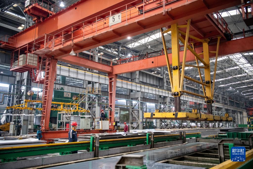 1月31日,在西南铝业(集团)有限责任公司生产车间,工人观察铝材吊运情况。新华社记者 唐奕 摄