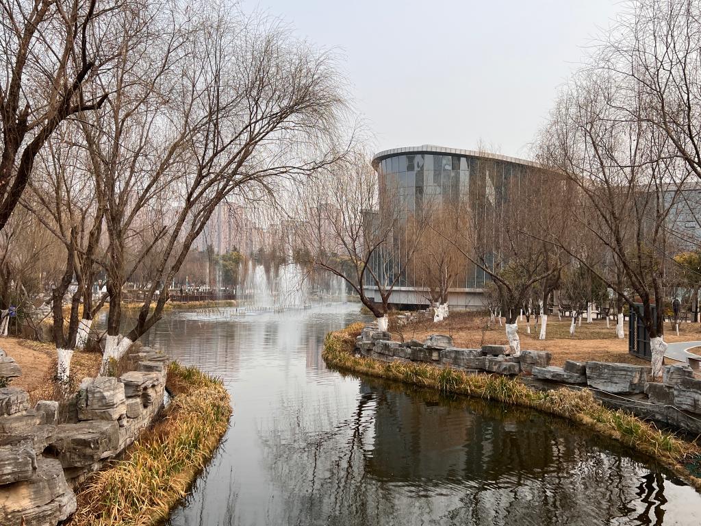 循环,让这座缺水城市也有了亲水之景。陶辉的身后,冬天的迎宾公园同样有着小桥流水的景观,供市民活动的小广场旁喷泉汩汩,而这些河道补水、景观用水都来自不断被循环利用的再生水。