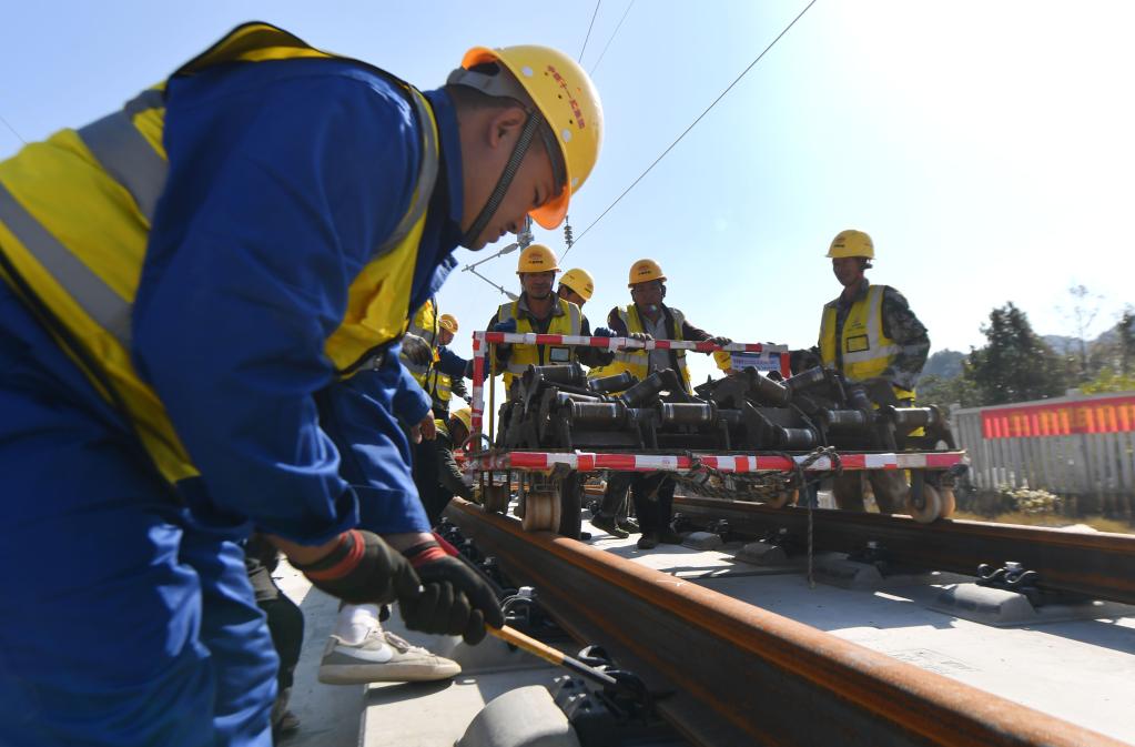 2021年12月1日,施工人员在常益长高铁黄桥大道特大桥铺轨现场施工。新华社记者 赵众志 摄