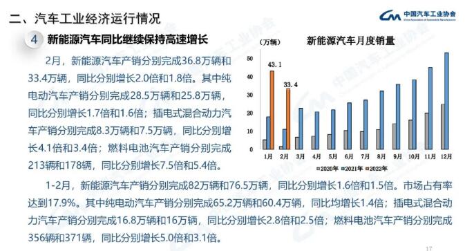 上证报中国证券网讯(记者 俞立严)中国汽车工业协会3月11日发布消息,2022年2月,中国汽车销量173.7万辆,同比上涨18.7%;1-2月累计汽车销量426.8万辆,同比上涨7.5%。在新能源汽车方面,中国2月份新能源汽车销量33.4万辆,同比上涨184.3%。1-2月份累计销量76.5万辆,同比上涨154.7%。