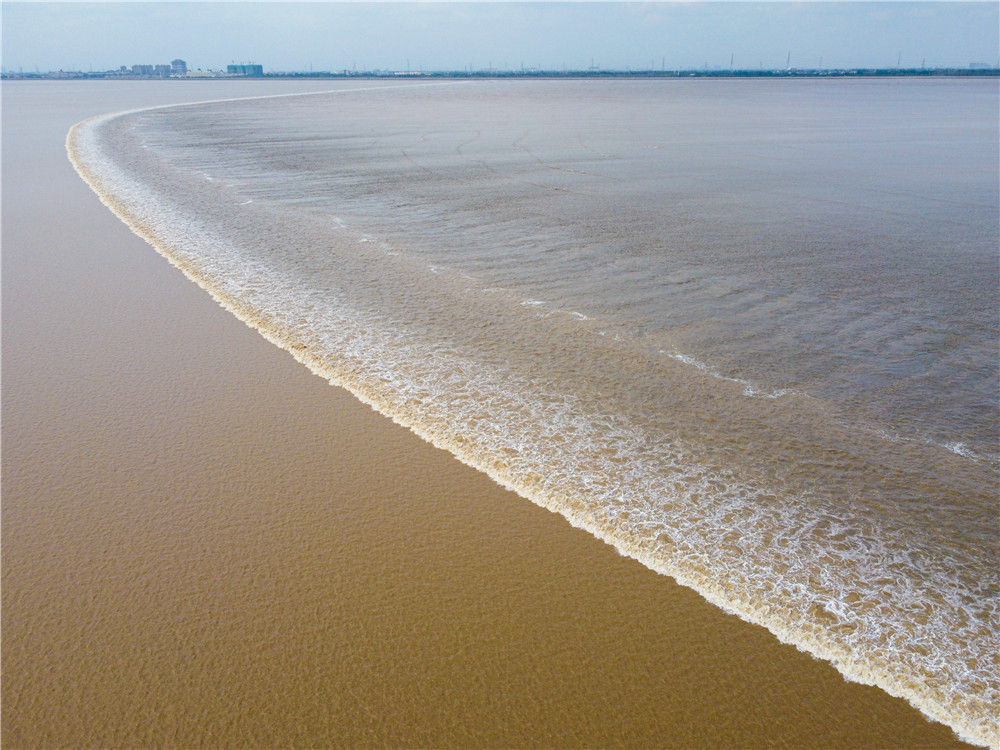 这是在杭州市钱塘新区拍摄的钱塘江一线潮奇观(2020年10月5日摄,无人机照片)。新华社记者 江汉 摄