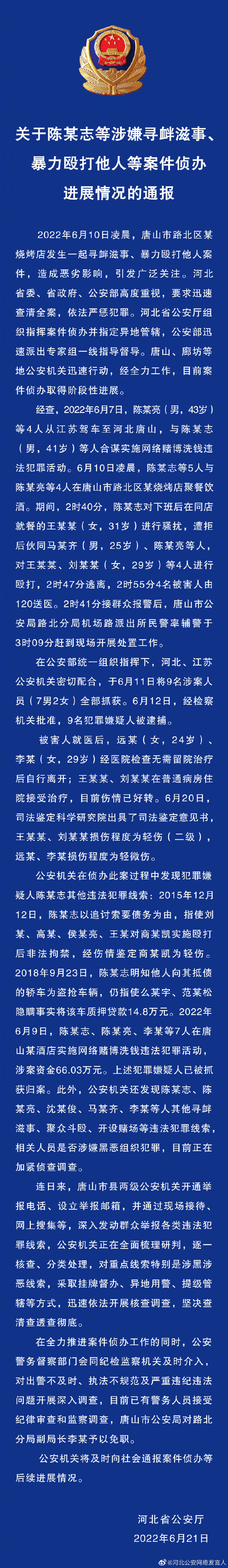 首页> 要闻>财经要闻 河北省公安厅:关于陈某志等涉嫌寻衅滋事、暴力殴打他人等案件侦办进展情况的通报 河北公安网络发言人微博 2022-06-21 10:16 关于陈某志等涉嫌寻衅滋事、暴力殴打他人等案件侦办进展情况的通报 微博截图