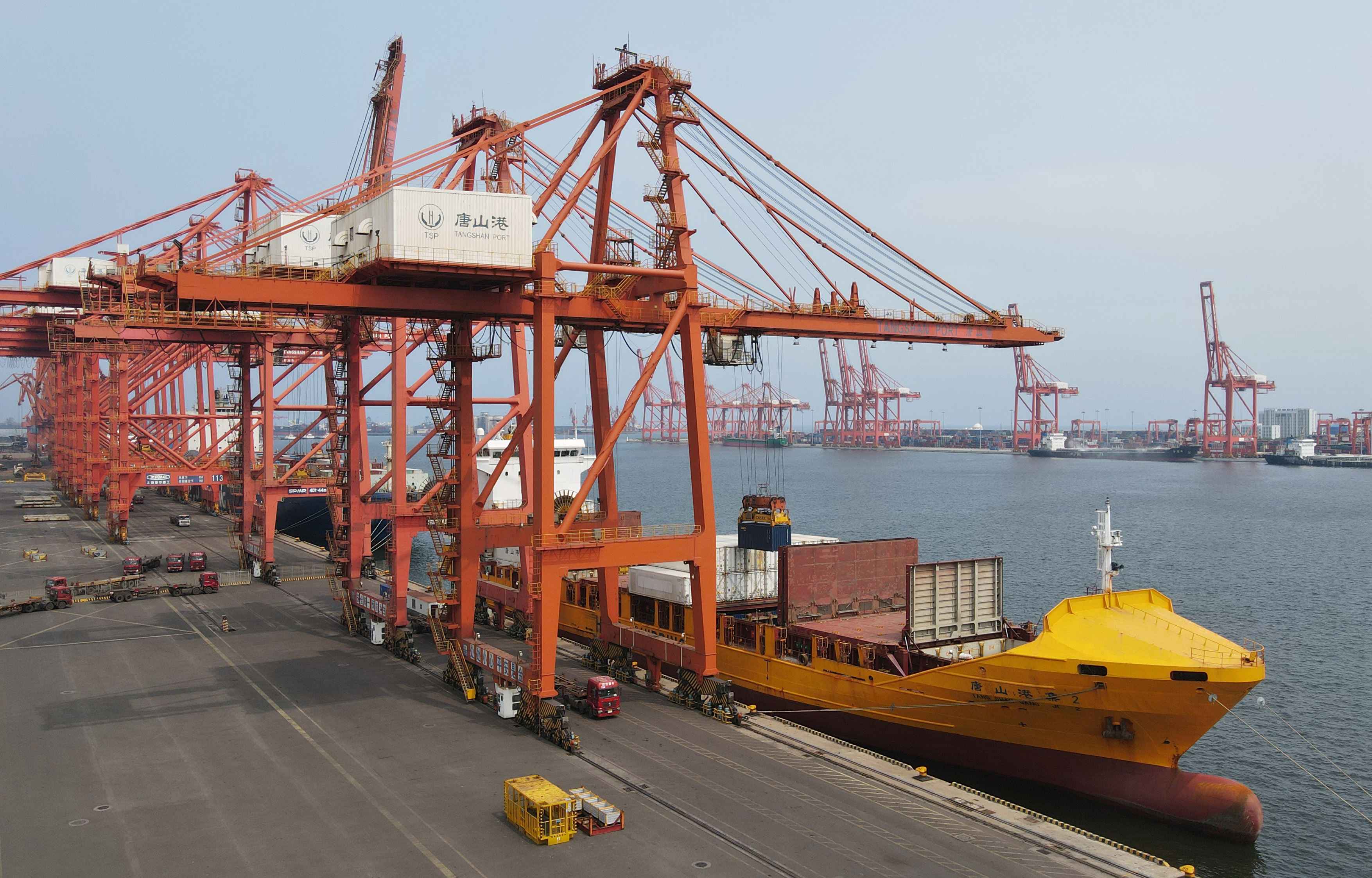 7月26日,一艘轮船靠泊在唐山港京唐港区集装箱码头装货(无人机照片)。