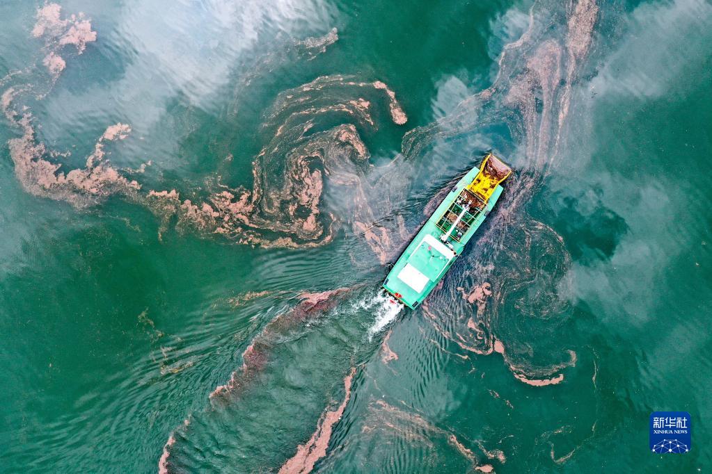 垃圾清理船在贵州省黔西市乌江源百里画廊江面上清理垃圾(2022年6月2日摄)。新华社记者 欧东衢 摄