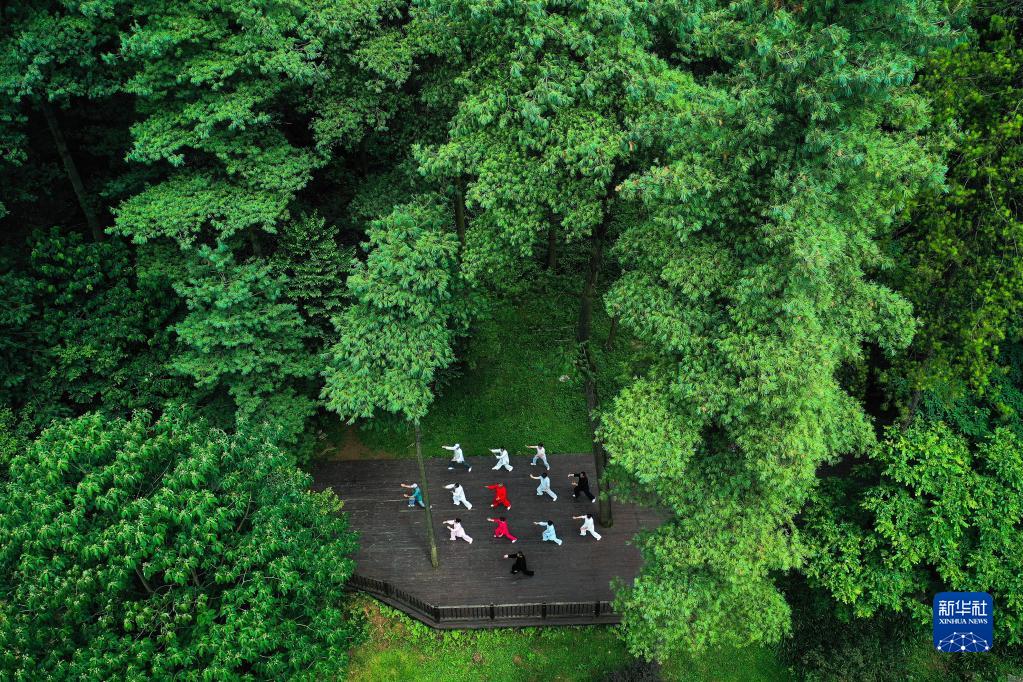 市民在贵阳市长坡岭国家级森林公园里健身(2022年7月13日摄,无人机照片)。新华社记者 杨文斌 摄