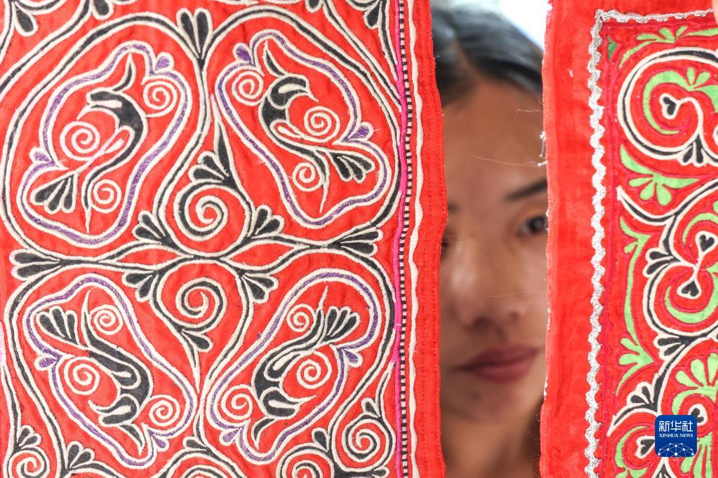村口一家苗绣车间中,27岁的苗族姑娘杨文丽正带着绣娘们飞针走线,赶制颇具苗族特色的旅游文创产品,一幅9米长的苗绣长卷即将完工。长卷画面上,错落有致的民居掩映在青山绿水间,身着少数民族服饰的村民们载歌载舞。