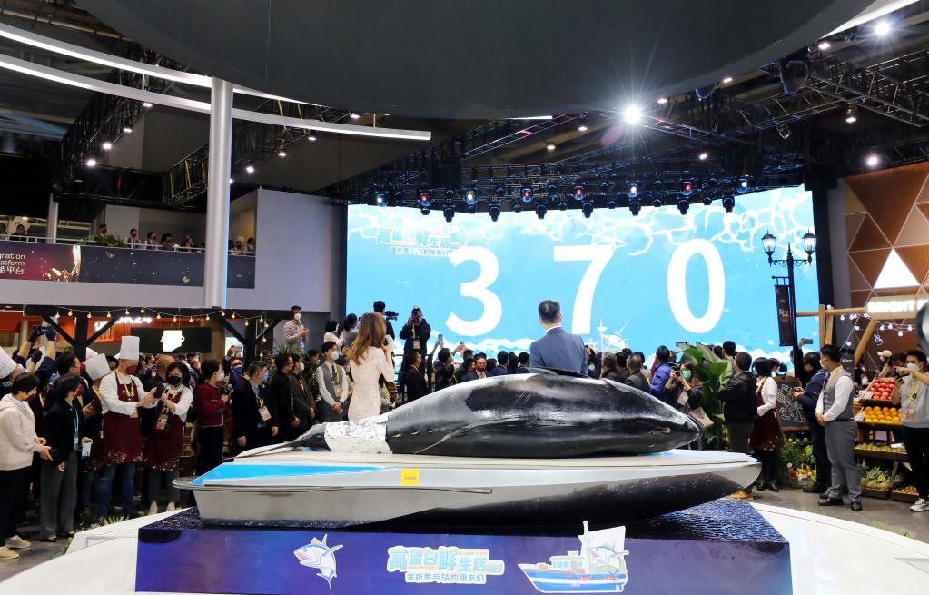 第五届进博会食品及农产品展区,一条370公斤重的蓝鳍金枪鱼来到展会现场。新华社记者 方喆 摄