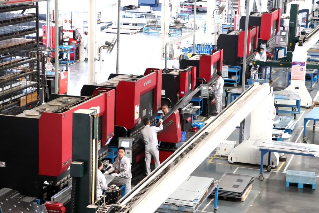 紧张生产中的中国西电集团西电宝鸡电气有限公司的钣金数控折弯加工线。(受访者供图)