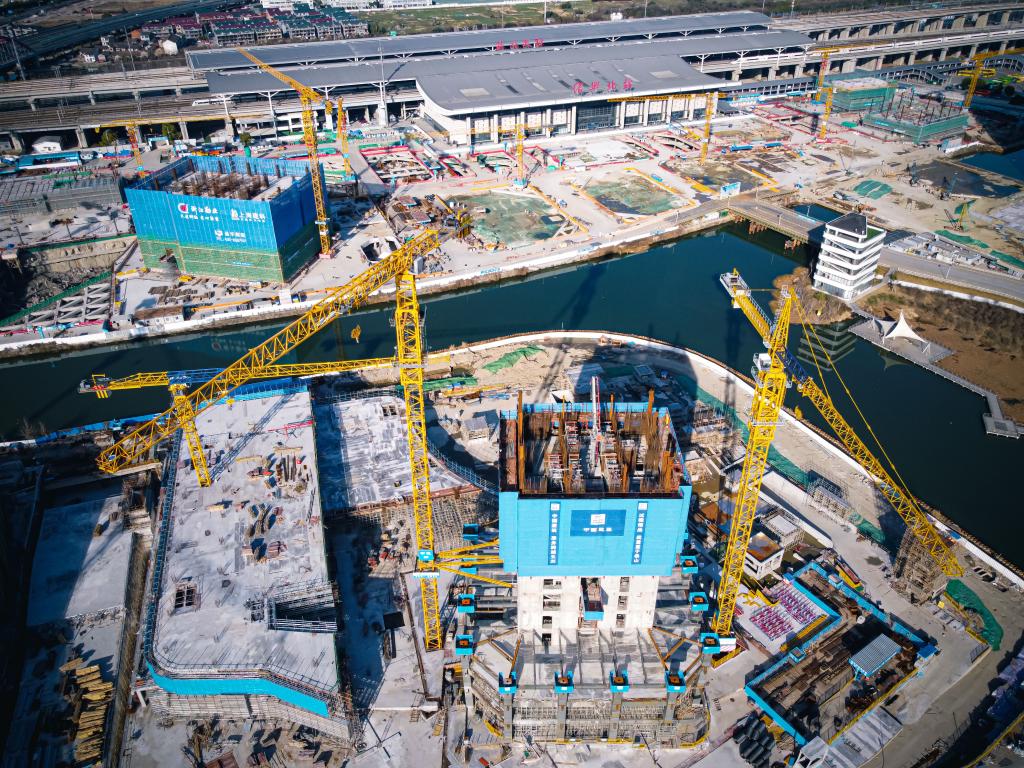 这是1月31日拍摄的由中建三局承建的绍兴北站TOD综合交通枢纽工程建设现场。新华社记者江汉摄