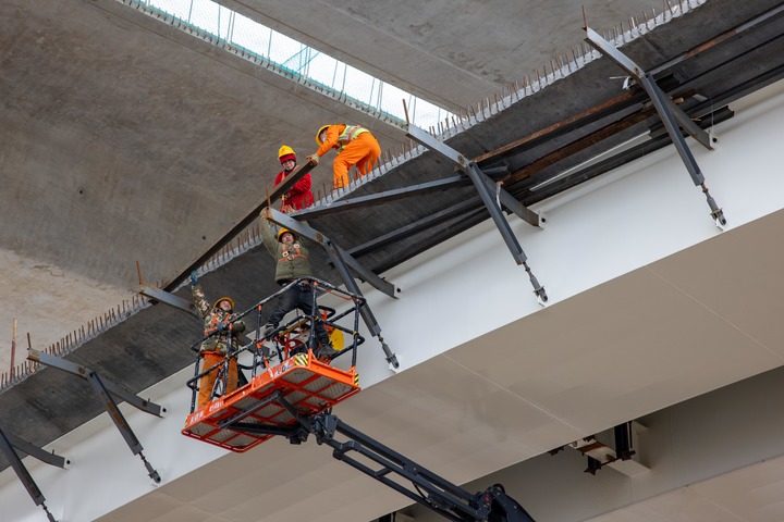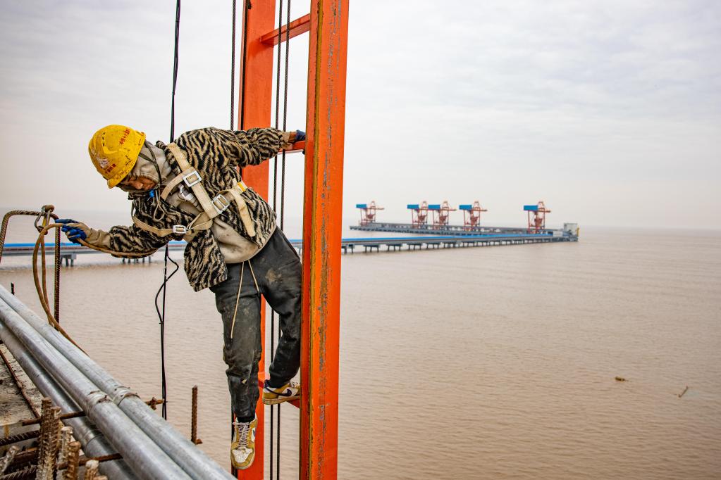 在由浙江交通集团主导投资建设的杭甬高速复线一期工程现场,工人们顶着呼啸的海风加紧施工建设亚洲最大的海上高速枢纽滨海互通项目。据介绍,杭甬高速复线一期工程全长约55公里,有近15公里是海上路段。