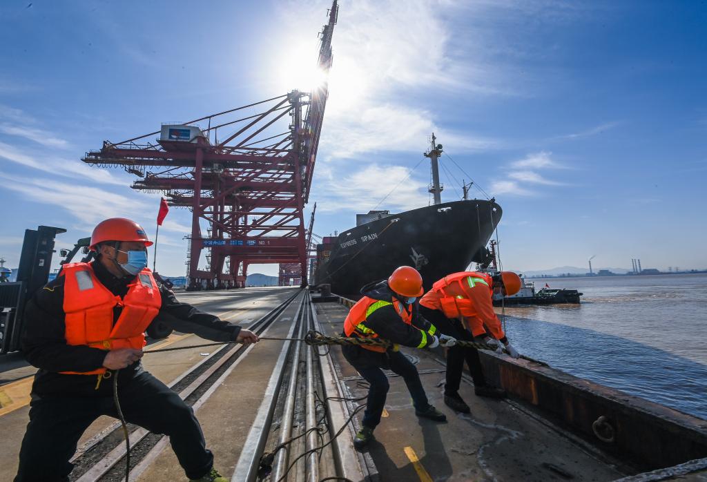 1月31日,在宁波舟山港金塘港区大浦口集装箱码头上,工作人员正在拉缆绳帮助一艘外籍货轮靠泊。新华社记者 徐昱 摄
