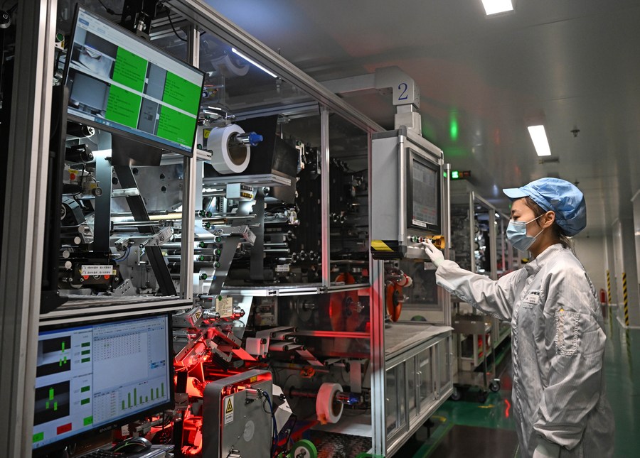 2月8日,在天津力神电池股份有限公司动力电池生产车间,自动化机械设备正在作业。新华社记者 赵子硕 摄