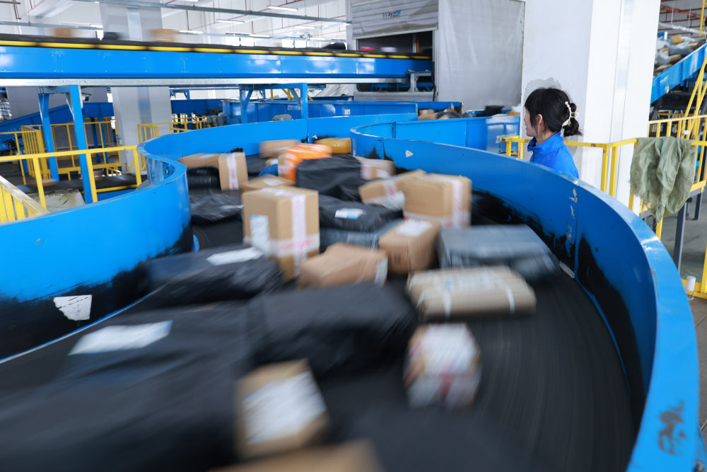 2月13日,大量包裹在贵州快递物流园内的自动分拣系统中运输。新华社记者 刘续 摄