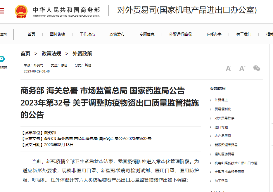 商务部 海关总署 市场监管总局 国家药监局公告2023年第32号 关于调整防疫物资出口质量监管措施的公告