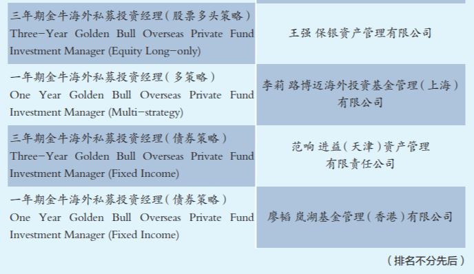 在第七届海外基金金牛奖评选中,华夏新视野中国A股基金、汇添富中港策略基金、安本基金–中国A股可持续股票基金3只海外中国基金荣获“三年期金牛海外中国股票基金”称号;广发国际资产管理有限公司、重阳国际资产管理有限公司2家海外私募荣获“三年期金牛海外私募管理公司(股票多头策略)”称号;上海保银资产管理有限公司的王强荣获“三年期金牛海外私募投资经理(股票多头策略)”称号。