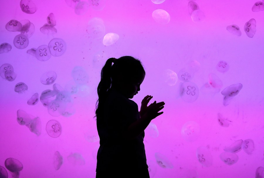 10月5日,小朋友在辽宁省沈阳海洋探索中心游览。新华社记者 龙雷 摄