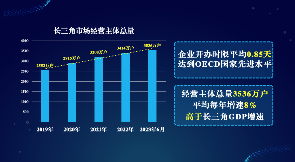 市场准入有速度。目前,长三角地区已实现市场准入登记标准、服务规范、信息共享、创新步调的“四个统一”,经营主体身份在线“一次验证、全网通用”和电子营业执照可共享复用。长三角地区企业开办时限提速至平均0.85天,达到OECD国家水平,经营主体总量增加到3536万户,年均增速8%,高于长三角地区GDP增速。