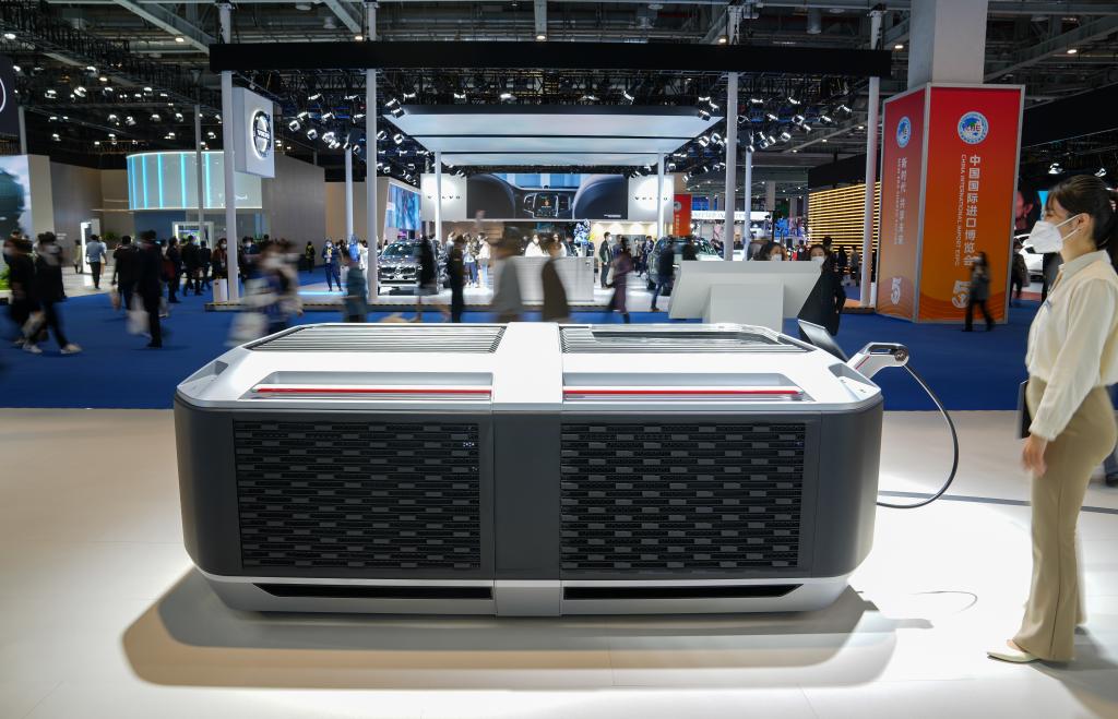 在第五届进博会汽车展区里,韩国现代汽车公司在展示氢燃料电池系统发电机。 新华社记者丁汀 摄