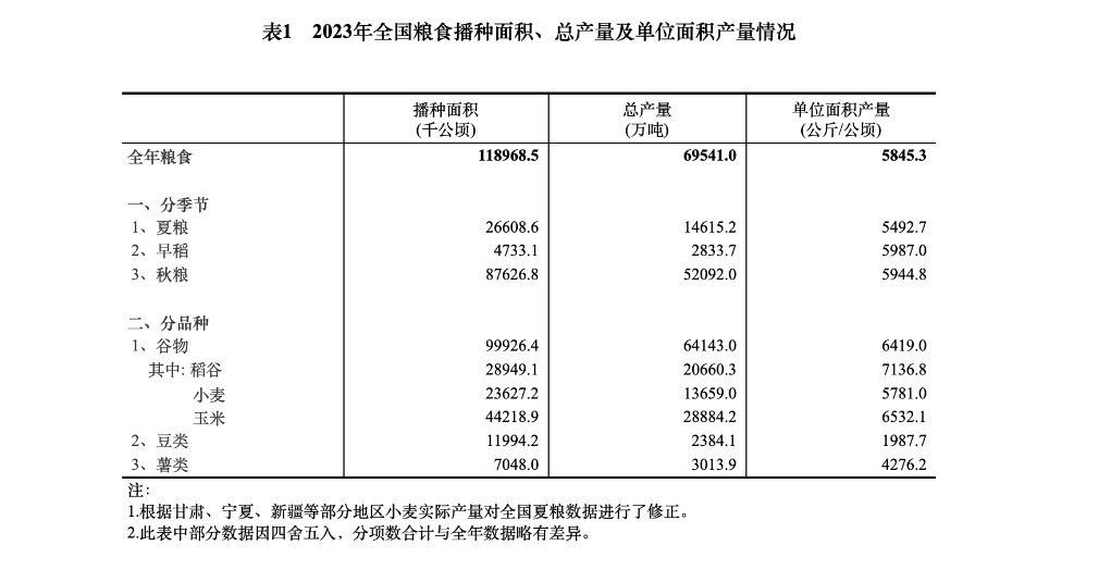 统计数据显示,2023年,全国粮食播种面积17.85亿亩,比上年增加954.6万亩,增长0.5%。全国粮食单产389.7公斤/亩,每亩产量比上年增加2.9公斤,增长0.8%。