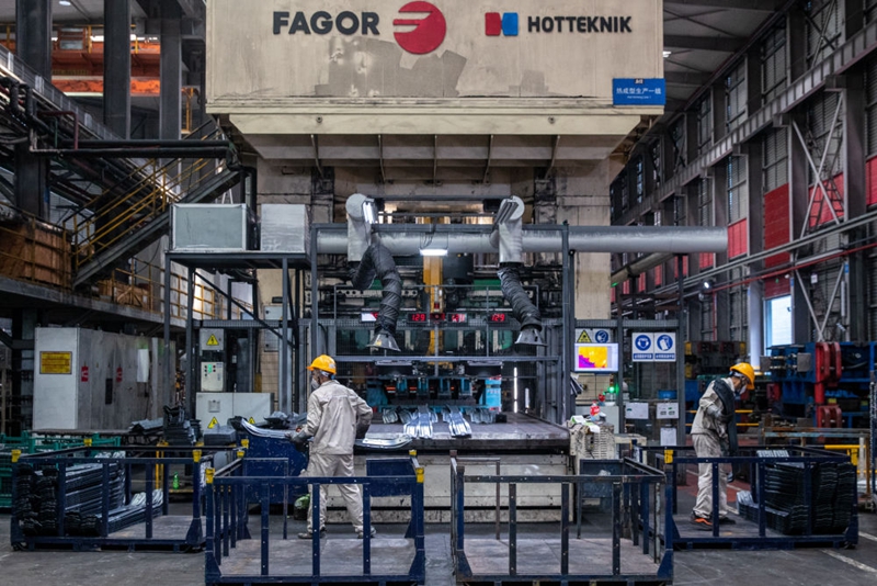 图为重庆两江新区一家机械设备生产企业的热压车间里,工人将刚下线的零件装箱。?新华社记者储加音 摄