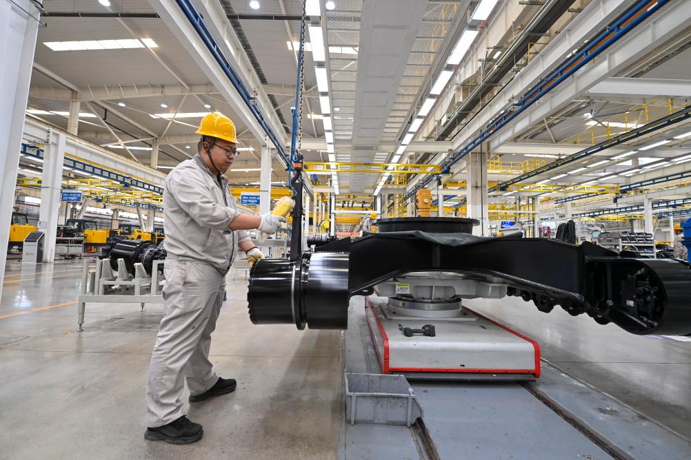 4月9日,工作人员在太重集团智能高端液压挖掘机产业园区内的智能生产线上作业。新华社记者 杨晨光 摄