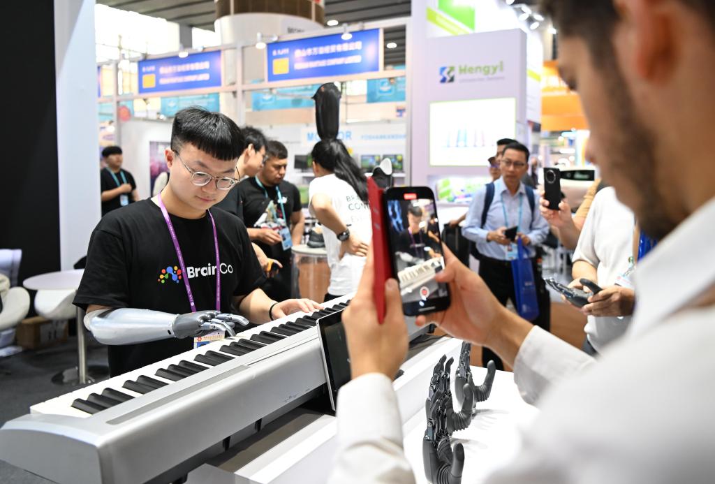 4月17日,佩戴智能仿生手的参展商工作人员在第135届广交会第一期“智慧生活”专区强脑科技展台演奏电子琴。新华社记者 邓华 摄