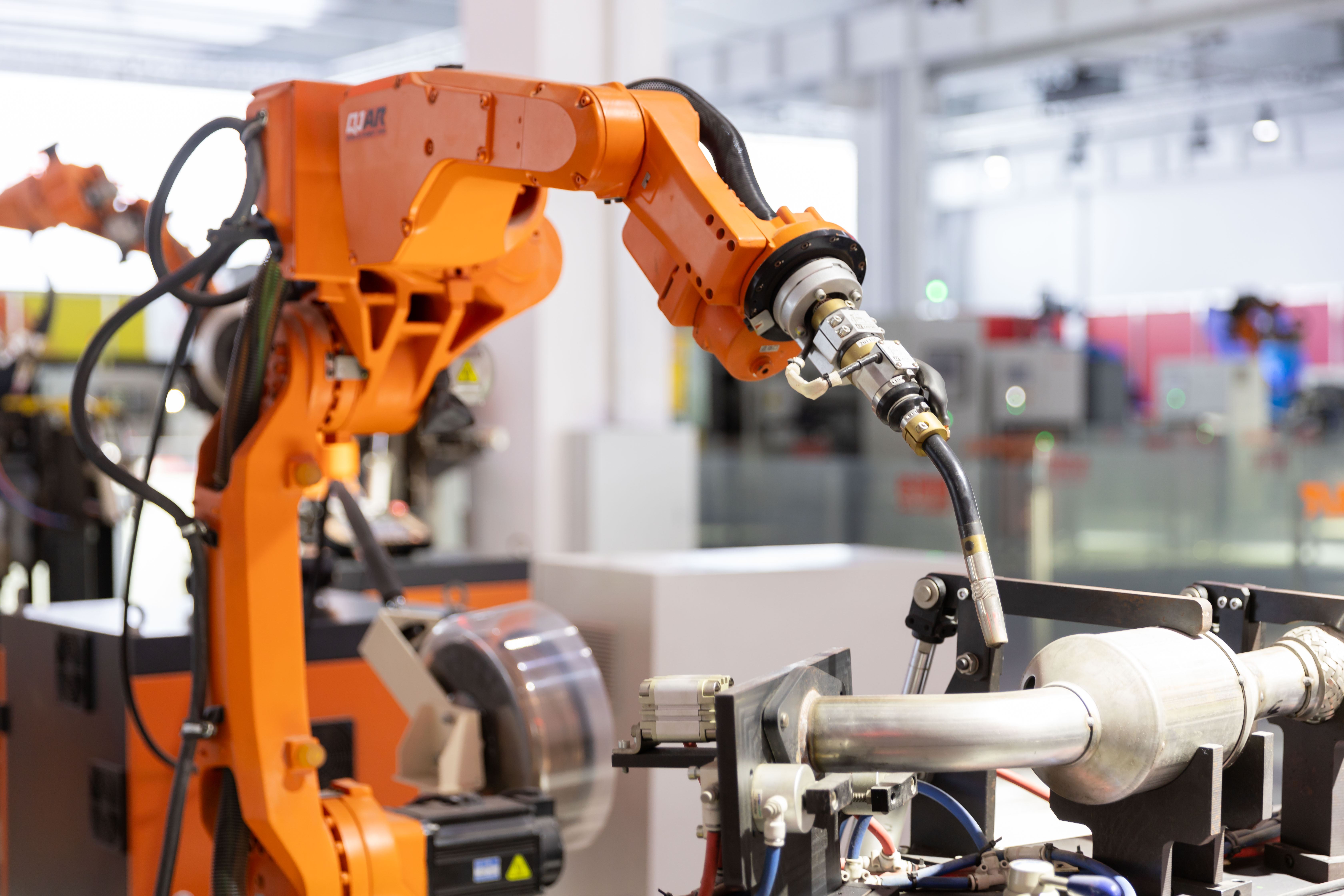 5月25日,在上海爱仕达机器人有限公司智能谷,工业机器人模拟焊接工作。