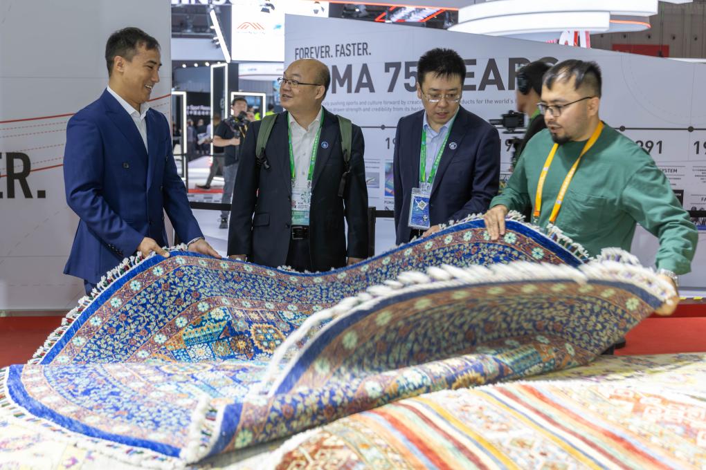 阿富汗客商阿里·法伊兹(左一)在第六届进博会消费品展区向客商介绍阿富汗地毯。新华社记者王翔 摄