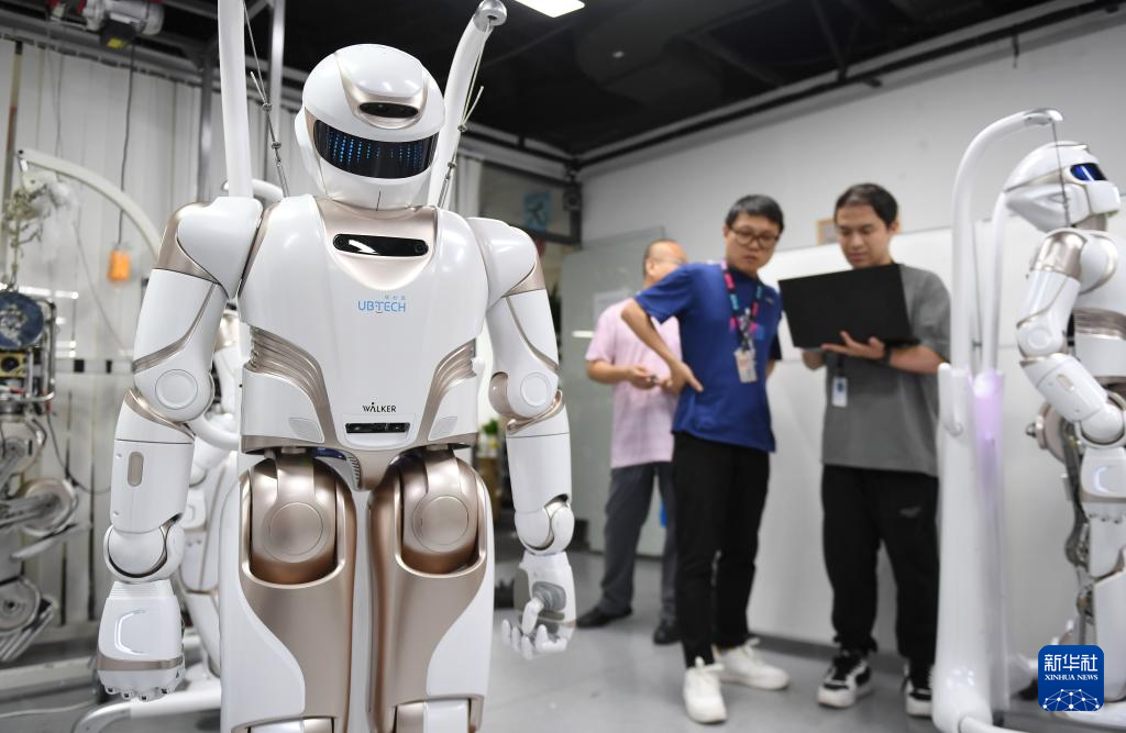 2024年6月26日,在位于深圳市南山智园的优必选总部,工作人员对人形机器人进行测试。新华社记者毛思倩 摄